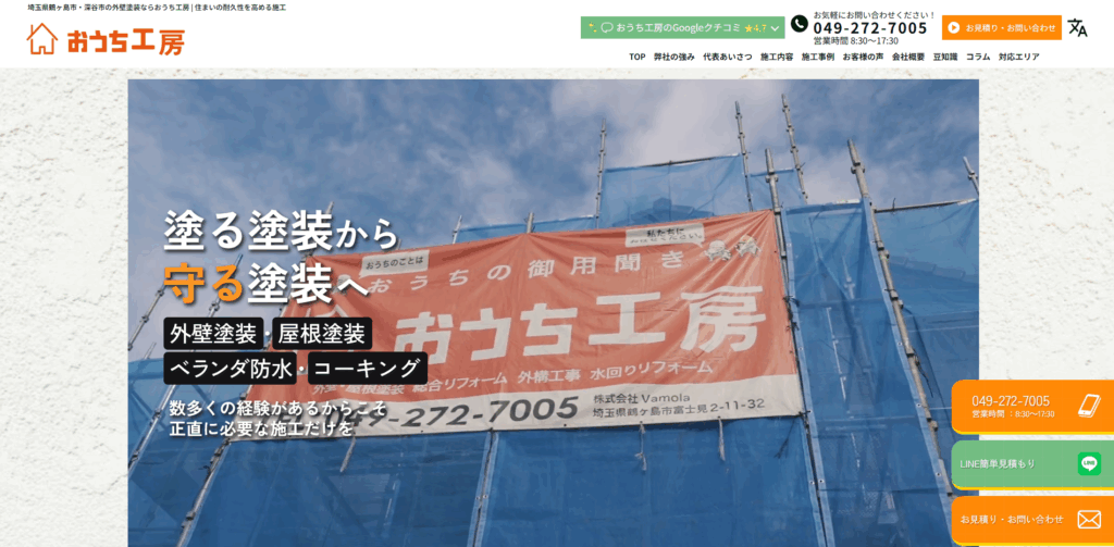 ホームページでは、会社概要・代表挨拶・施工事例・お客様の声・対応エリアなどをわかりやすく掲載し、「どんな会社で、どんな仕事をしているのか」を伝えることが重要です。